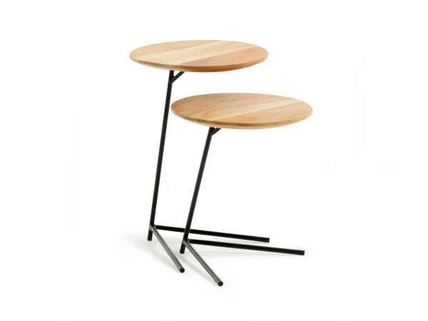 Het blad van de Asha bijzettafel is gemaakt van massief acaciahout. Hij rust op een metalen voet met drie gekruiste poten. Het metaal is zwart geverfd, de perfecte afwerking om te combineren met dit hout. Met de Asha bijzettafels heb je een uniek stuk met een eigen houtnerf. Een prachtige, functionele set van twee tafeltjes. Te gebruiken waar je maar wilt!