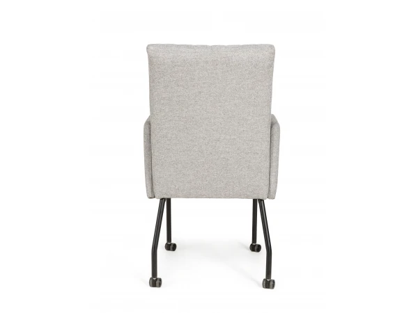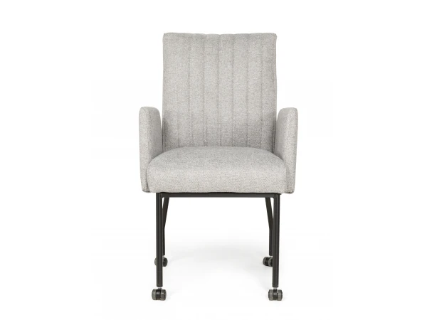 Deze moderne armstoel Treviso is een elegant exemplaar. De stijlvolle stoel heeft een licht grijze zitting met armleuningen en zwarte metalen poten. De poten zijn vergezeld van handige wieltjes dus je rolt er vlot mee over de vloer. De rugleuning heeft een leuk gestreept detail.