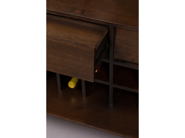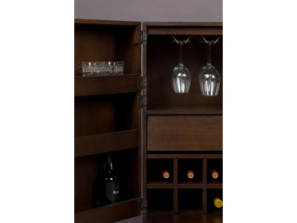 - Bevat 2 deuren met opberg schappen, 2 schuiflades, 6 rijen voor wijnglazen en 16 (!) compartimentjes voor flessen