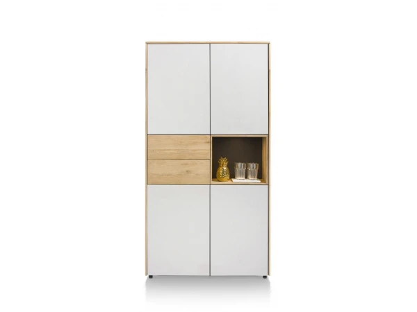 Bergkast Darwin van Xooon is een strakke kast die goed past in moderne en Scandinavische interieurstijlen, dankzij de combinatie van het lichte hout met het wit en de zwartmetalen poten. Deze bergkast is 100 cm breed en voorzien van 4 deuren, 2 laden en 1 met LED verlichte open niche om je mooiste items in uit te laten blinken.