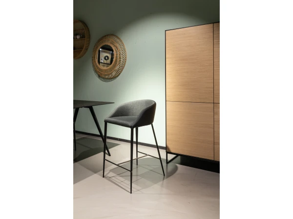 Barstoel Otis van Christl Dekimpe bestaat uit een omhulsel van zwarte lederlook, en een grijze stof voor de zitting. Het zachte grijs en stoere zwart zorgt voor een mooi contrast tussen de materialen. Deze dynamiek wordt nog meer versterkt door de zwart metalen poot met tussenstuk in RVS. Een moderne barstoel voor de hedendaagse keuken.