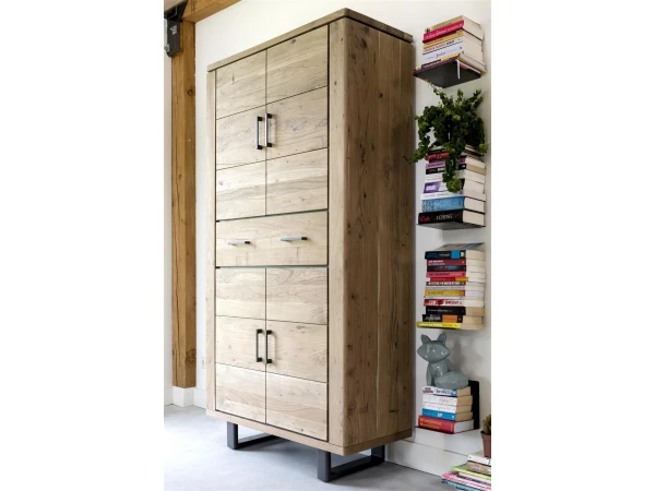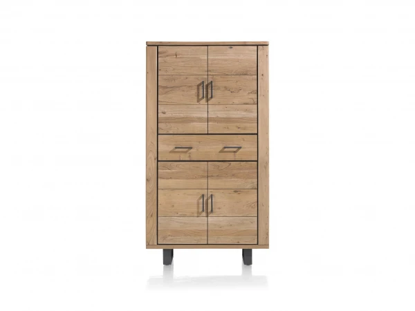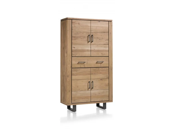 Deze bergkast uit de Quebec collectie heeft 4 deuren en 1 lade met soft-closingsysteem. Je hebt dus genoeg plek om jouw spullen in kwijt te kunnen. De stijlvolle kast staat op stevige zwart metalen poten, wat het houten geheel een luchtig gevoel geeft.