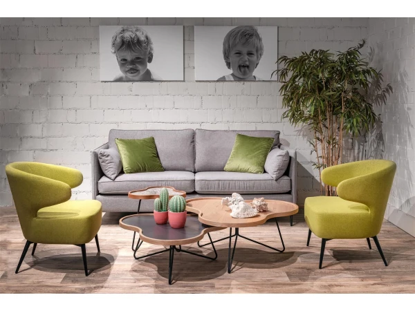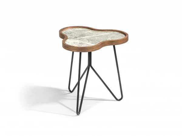 Dit leuke salontafeltje of bijzettafeltje heeft een tafelblad in keramiek met grijs gevlamd patroon. De rand werd afgewerkt met een houten kader dat de elegante lijnen van het tafelblad volgt, wat een beetje doet denken aan een klaverblad. Het bijzettafeltje werd afgewerkt met een fijne, metalen driepoot.
