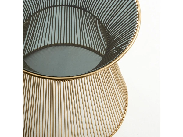 Bijzettafel Jolene heeft een rond blad in zwart doorschijnend glas en een onderstel gemaakt van ijzeren staven met gouden afwerking. Dit resulteert in een prachtig ontwerp met een elegante uitstraling. Het is ideaal om deze bijzettafel naast de zetel te plaatsen.