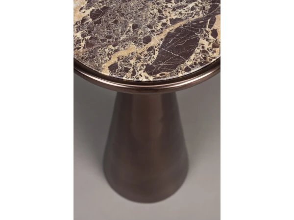 Vervaardigd uit gerecycled aluminium met een marmeren tafelblad, straalt bijzettafel Mount karakter uit en brengt een warme sfeer in elke ruimte. De diepe bruine tint voegt een vleugje elegantie toe aan je interieur. Mount is verkrijgbaar in twee formaten, waardoor je ze moeiteloos kunt combineren voor een prachtig geheel!