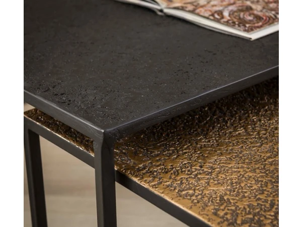 Deze trendy bijzettafel set is uitgevoerd in ‘metallic’ antiek brons en zwart, wat de tafeltjes een unieke uitstraling geeft. Deze set kan je combineren met verschillende stijlen, een echte must have! Deze set is een echte eye-catcher en maakt deel uit van de ‘metallic’ serie. …