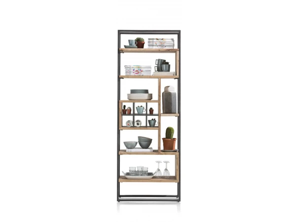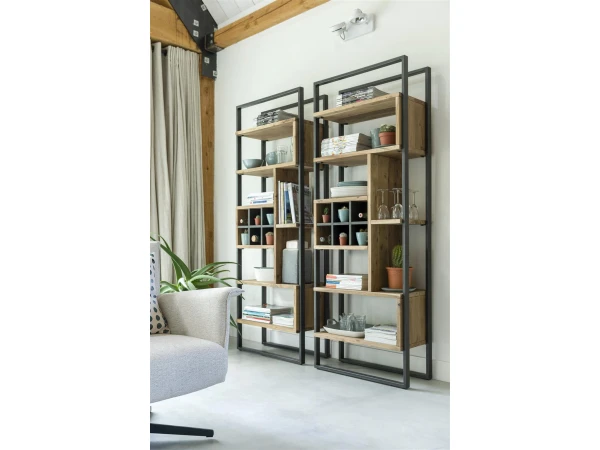 Deze boekenkast uit de Quebec collectie heeft niches en een wijnrek. Je hebt dus genoeg plek om jouw spullen in kwijt te kunnen. De stijlvolle kast staat op stevige zwart metalen poten, wat het houten geheel een luchtig gevoel geeft.