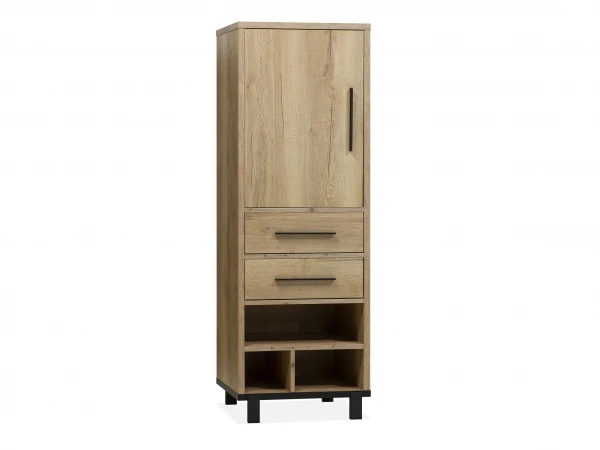 Deze broodkast heeft 1 deur, 2 laden en 3 open vakken, en biedt daarmee zowel uitstal- als opbergruimte. Deze smalle hoge kast neemt niet veel ruimte in beslag, en kan zo gemakkelijk in een kleinere woonkamer geplaatst worden.