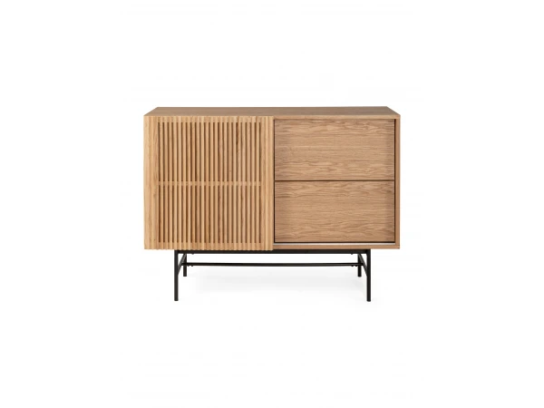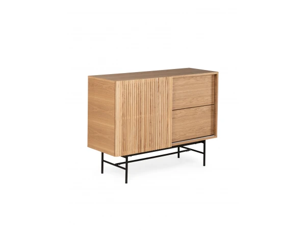 Deze commode uit de Dunes collectie is gemaakt uit MDF fineer. Het heeft 2 laden en 2 schabben met een elegante schuifbare deur. Het geheel staat op elegante zwart metalen poten.