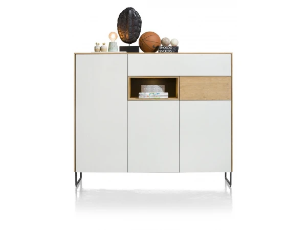 Dressette Darwin van Xooon is een strak opbergmeubel dat goed past in moderne en Scandinavische interieurstijlen dankzij de combinatie van het lichte hout met het wit en de zwart metalen poten. Deze dressette is wat hoger dan een normaal dressoir en 160 cm breed. Dresette Darwin bevat 3 deuren, 2 laden en 1 met LED verlichte open niche.