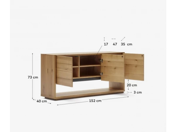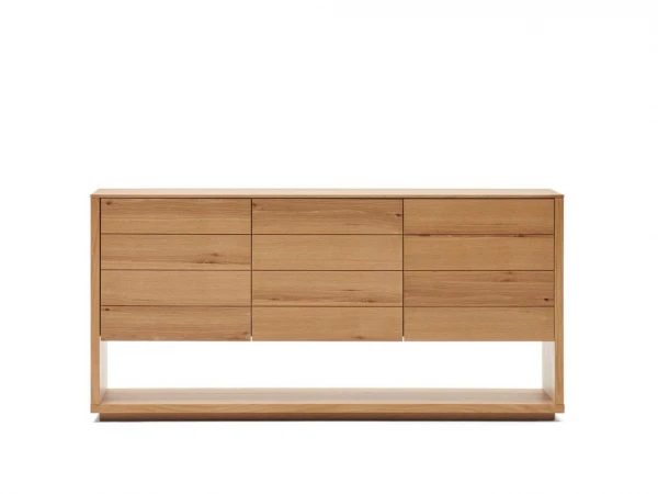 Het Alguema dressoir van Kave Home brengt een natuurlijke en rustgevende sfeer in je interieur. Met zijn prachtige afwerking in eiken fineer voegt dit dressoir een tijdloze flair toe aan je ruimte. De kast geeft de indruk over lades te beschikken, maar eigenlijk bestaat het uit 3 deuren met daarachter telkens 2 legplanken. Deze deuren openen moeiteloos dankzij het handige snap-mechanisme en sluiten zachtjes dankzij de soft close functie. Bovendien zijn de poten verstelbaar voor een perfecte balans en stijl. Laat Alguema je interieur versterken met zijn tijdloze en minimalistische design.