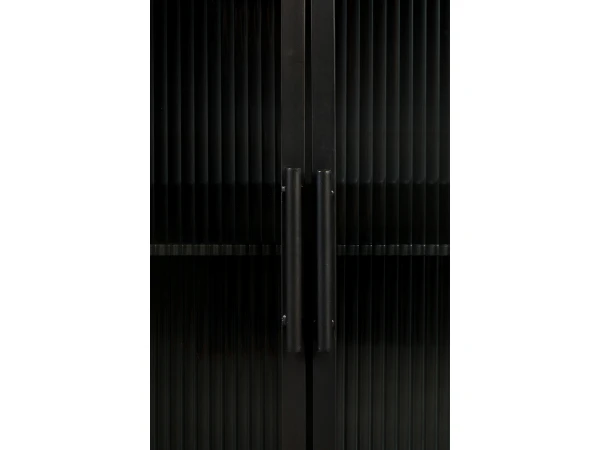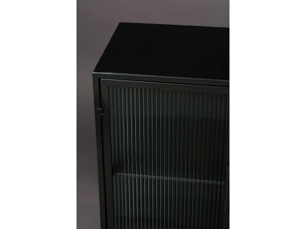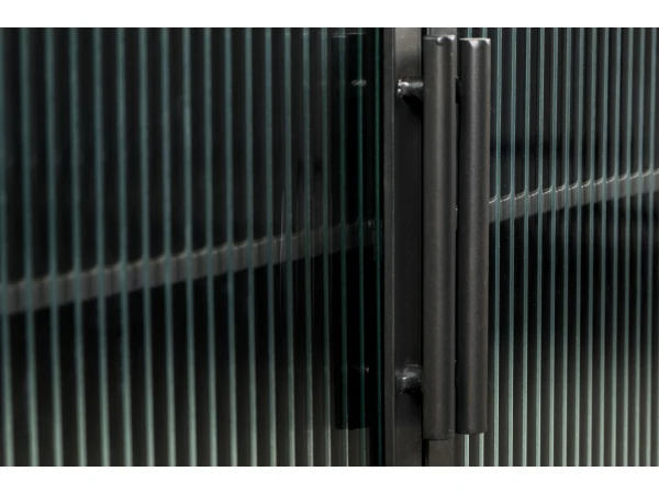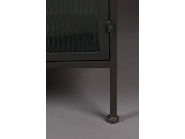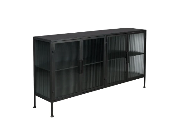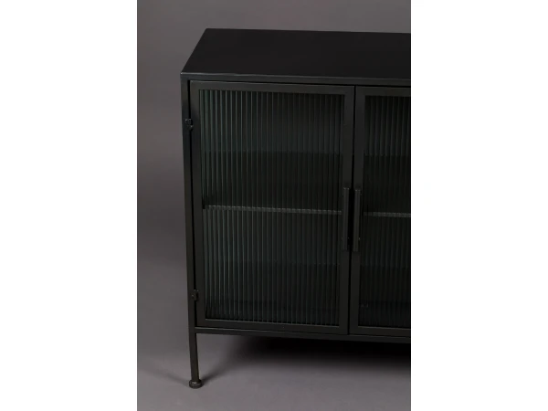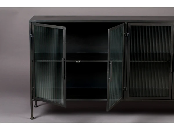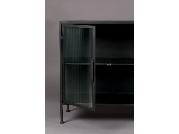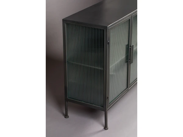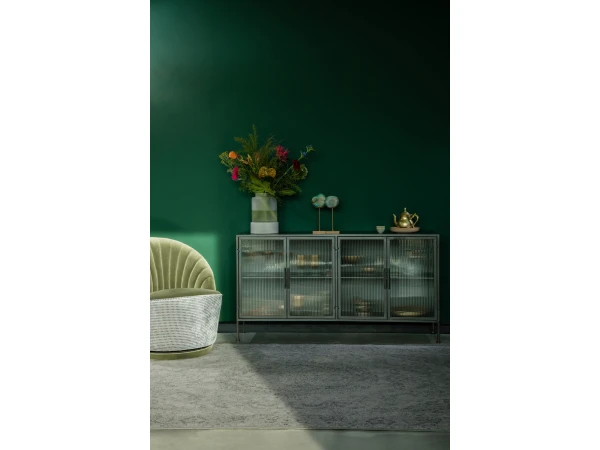 De glazen deuren van dressoir Boli geven een luchtige uitstraling, dit zonder ervoor te zorgen dat je heel duidelijk ziet wat er in de kast ligt. Het geribbeld glas laat vaag de inhoud zien maar zorgt voor voldoende privacy. De stalen omkadering en onderstel laat de dressoir passen binnen de industriële stijl.