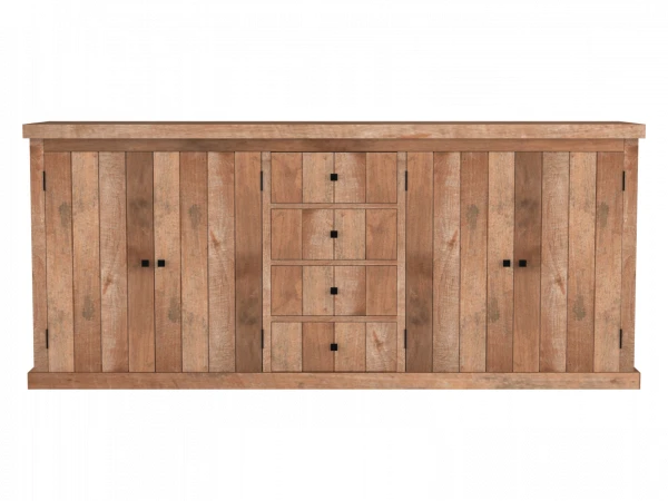 Deze landelijke dressoir in teak heeft een natuurlijke, warme uitstraling. Deze dressoir zorgt voor een gezellige setting in je woonkamer, een landelijke sfeer. De dressoir heeft 4 deuren en 4 laden, met achter elke deur een legplank, voor veel opbergruimte. Deze landelijke dressoir past het best in een hedendaags landelijk interieur. De afwerking in metaal, waaronder de knopjes en binnenkant van de lades, zorgen voor een moderne toets.
