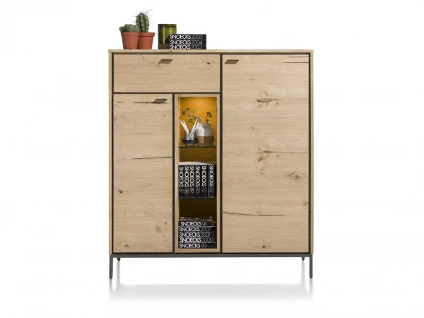 Onze Faneur serie is een moderne, tijdloze serie. De serie is voorzien van een lichte houtlook met mooie nerfstructuur. De details zijn strak en subtiel, met kleine handvaten en smalle poten. Dit highboard Faneur is voorzien van 2 deuren, 1 lade en 3 met LED verlichte niches.