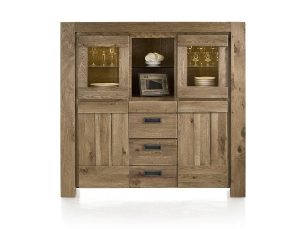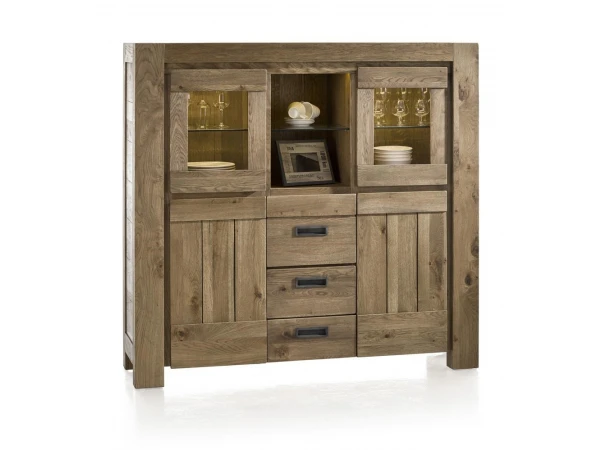 Deze highboard is uitgevoerd in eiken, deels massief. Om deze eetkamer aan uw stijl en interieur aan te passen heeft u keuze uit vier kleuren: Castle, Sand, Castle White en Nature White. Deze kleuren zijn alle vier geolied om het natuurlijke karakter van het hout te behouden. De deuren en lades in dit meubel zijn afgewerkt met een soft-closing systeem. De decoratieve Ledverlichting is inbegrepen.