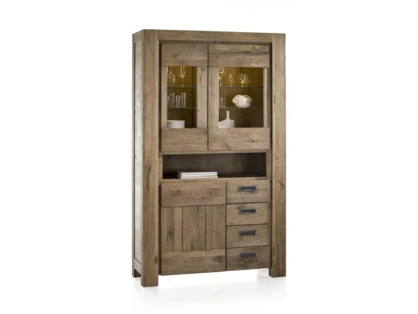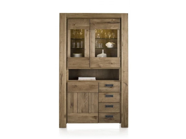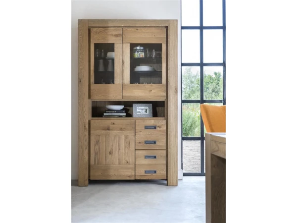 Deze vitrine is uitgevoerd in eiken, deels massief. Om deze eetkamer aan uw stijl en interieur aan te passen heeft u keuze uit vier kleuren: Castle, Sand, Castle White en Nature White. Deze kleuren zijn alle vier geolied om het natuurlijke karakter van het hout te behouden. De deuren en lades in dit meubel zijn afgewerkt met een soft-closing systeem.