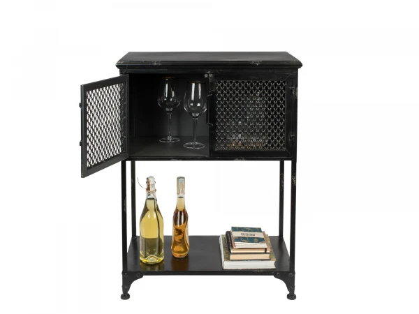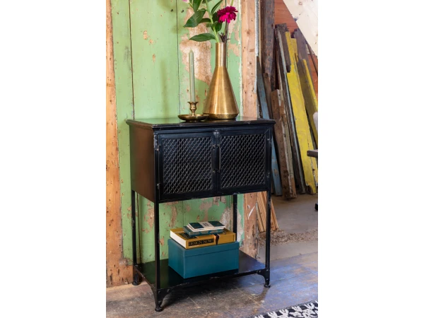 Op zoek naar een klein wandkastje met veel mogelijkheden? Denver is een kastje met twee deuren met diamantpatroon, waardoor je de inhoud van de kast nog subtiel kan zien. Ideaal als barkast in de living of als wandkast in de inkomhal. Ook in de bureau past dit kastje perfect. De stoere look van deze industriële kast, wordt extra versterkt door de afgebladerde verf.