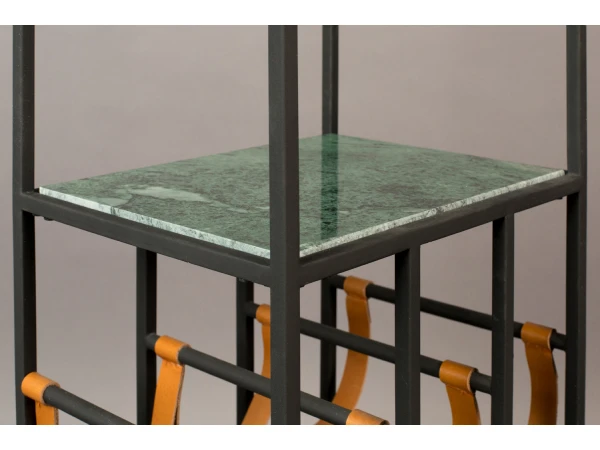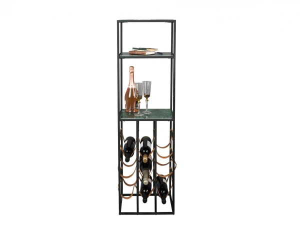 Kijk jij ook altijd uit naar het weekend? Dan mag dit rekje niet ontbreken in je woonkamer, want met Mil is het elke dag feest! Dit prachtige rekje met leggers in groen marmer is uiterst stijlvol. Bovendien is het de beste plaats om je favoriete wijnen te verzamelen. Dankzij de lederen banden, is er plaats voor 9 flessen wijn. Op de leggers kan je vervolgens je mooiste wijnglazen, karaf of andere mooie flessen plaatsen. Het metalen frame geeft dit rekje bovendien een moderne uitstraling
