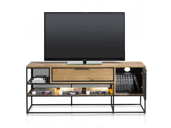 Spreekt de industriÙle loft-stijl je aan en ben je op zoek naar een tv-meubel dat hier goed bij past? Dan is dit lowboard uit de City collectie een fijn meubelstuk. Opvallend is het speelse en moderne lijnenspel van dit tv-meubel. De metalen accenten combineren perfect met het eikenfineer in de kleur Railway brown of Castle antraciet. Het lowboard is 150 cm breed, heeft 1 deur, 1 lade en 2 niches die zijn voorzien van ledverlichting. Handig is het kabelopbergsysteem, zodat alle snoeren netjes georganiseerd kunnen worden weggewerkt.