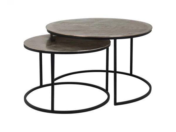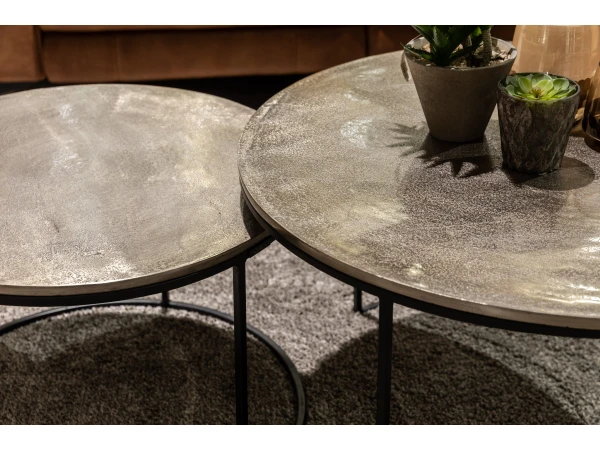 Deze stijlvolle tafeltjes komen als een set van 2. Gebruik ze samen als salontafel of als bijzettafels. De tafels schuiven gemakkelijk in elkaar, waardoor je desgewenst meer of minder tafelruimte kunt creëren. Het tafelblad is afgewerkt met een metalen coating. Het zwarte onderstel is weer helemaal in!