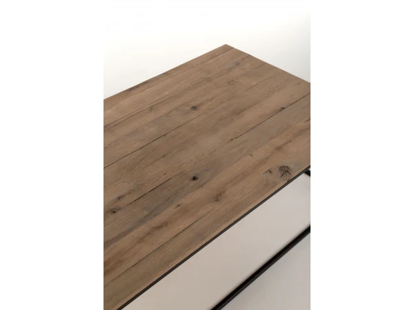 Deze salontafel staat prachtig in elke woonkamer! Deze salontafel heeft een trendy metalen onderstel en een blad uit massief hout. Als je erover wrijft voel je de natuurlijke structuur van het eikenhout. Combineer met de andere meubelen uit de Farbo collectie voor een evenwichtig interieur.
