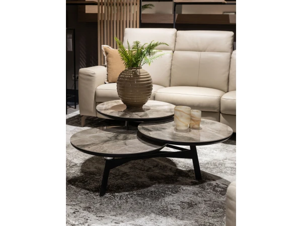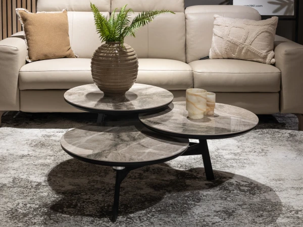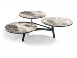 Deze prachtige salontafel heeft een elegant onderstel in zwart metaal, aangevuld met drie ronde tafelbladen, afgewerkt met toplaag in keramiek emperador. De speling met ronde tafelbladen in drie verschillende hoogtes geeft deze salontafel een uniek design. De afwerking in keramiek met marmeren look geeft de salontafel een chique karakter.