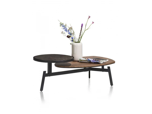 Salontafel Halmstad is een prachtige tafel in uniek Scandinavisch design, ge´nspireerd door de jaren ’50 en ’60. Deze salontafel met retro touch heeft twee tafelbladen in verschillende hoogtes. Hij is uitgevoerd in wild eikenhout in choco brown kleur gecombineerd met een bovenblad in zwarte marmerlook. Salontafel Halmstad staat op een zwart metalen frame en heeft een klassieke en elegante uitstraling.