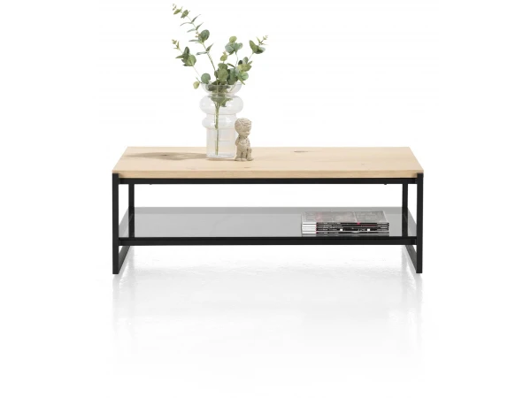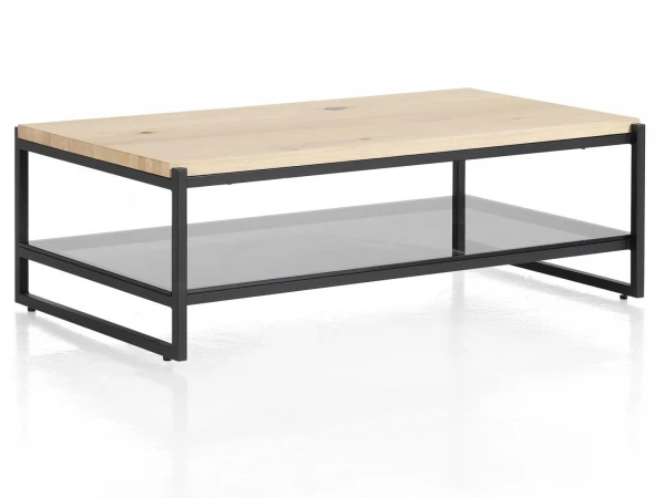 Deze salontafel uit de Modali collectie beschikt over een glazen en eiken blad die je volledig naar wens boven of onder elkaar kunt plaatsen. De stijlvolle salontafel staat op stevige zwart metalen poten, wat het houten geheel een luchtig gevoel geeft. Tip: je kan deze salontafel mooi combineren met de hogere variant van deze tafel met glazen blad.