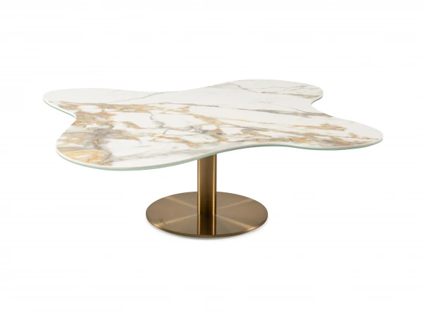 Deze moderne salontafel van Christl Dekimpe wordt met zijn gelakt bronzen tafelblad en goudkleurige poot ongetwijfeld een mooie blikvanger in je interieur!