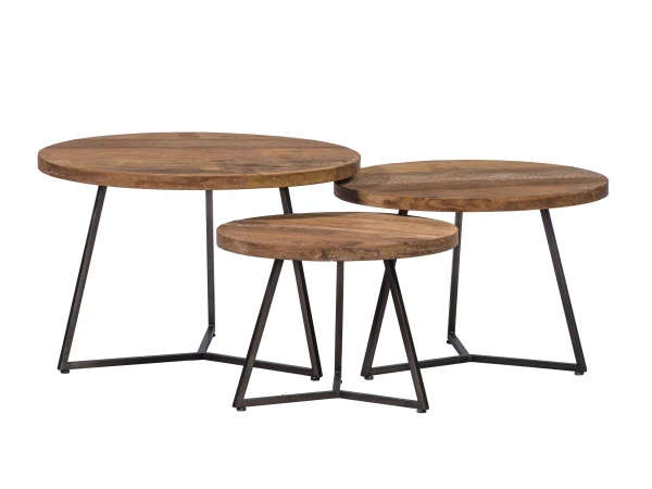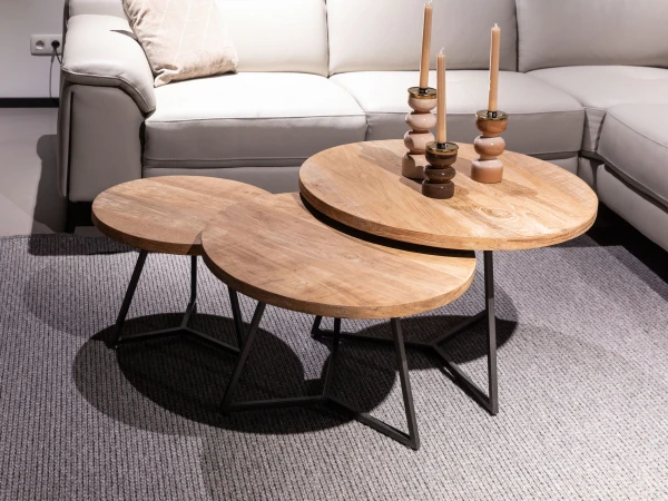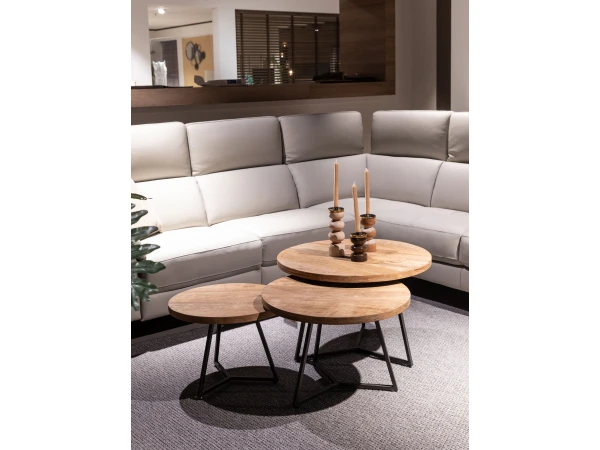 Deze set van 3 ronde bijzettafeltjes kun je ook gemakkelijk als salontafel gebruiken. Ze ogen modern en passen in elk type interieur, zowel in een landelijk als industrieel interieur. Het robuuste onderstel oogt sierlijk en stevig tegelijk. Het tafelblad in massief hout brengt een warme, gezellige sfeer in je zithoek. Een prachtige set salontafels!