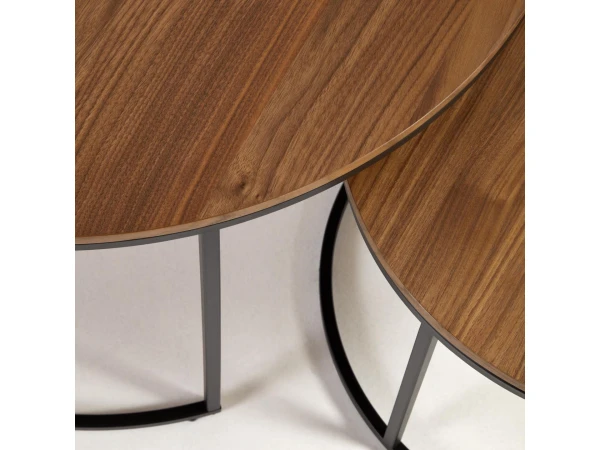 Met de set van 2 bijzettafels Yoana van Kave Home haal je een praktische schoonheid in huis. De tafels hebben een prachtig blad in walnootfineer en een frame van mat zwart gelakt metaal. Deze veelzijdige stukken passen naadloos in elke interieurstijl. Of je ze nu deels onder elkaar plaatst of volledig, de set biedt flexibiliteit om de ruimte naar wens in te richten en optimaal te benutten.