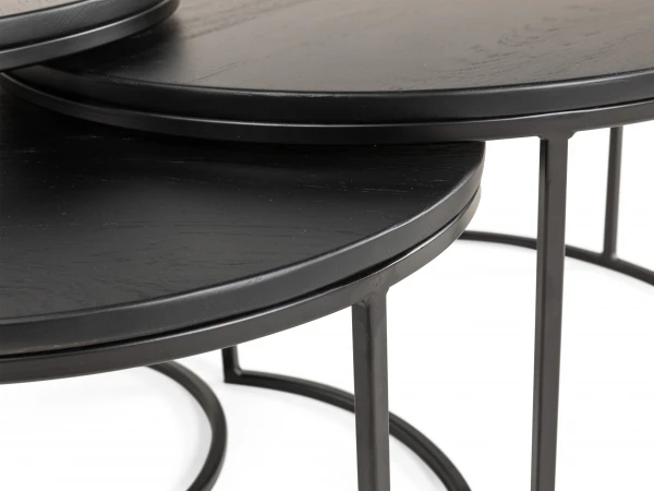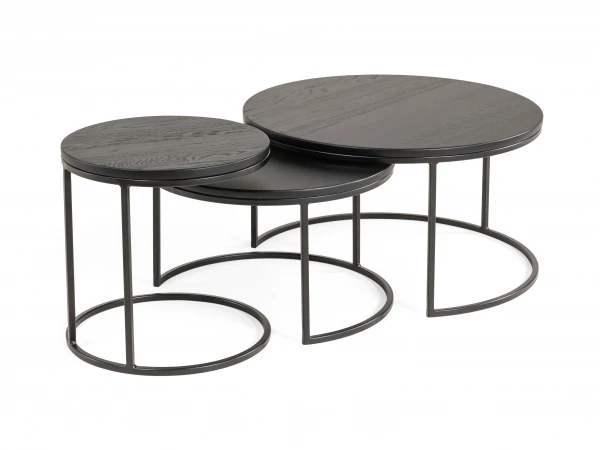 Deze set salontafels komt uit de Glasgow collectie. Deze drie salontafeltjes kun je gemakkelijk uitschuiven bij nood aan meer tafelruimte, bijvoorbeeld voor een gezellig aperitief. Daarna kun je ze gemakkelijk weer in elkaar schuiven. Deze set salontafels met onderstel in zwart metaal heeft een trendy ontwerp. De combinatie van hout met metaal geeft jouw interieur een moderne en gezellige uitstraling.