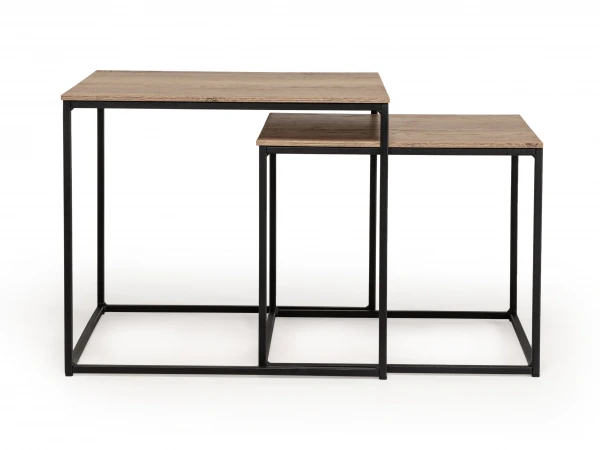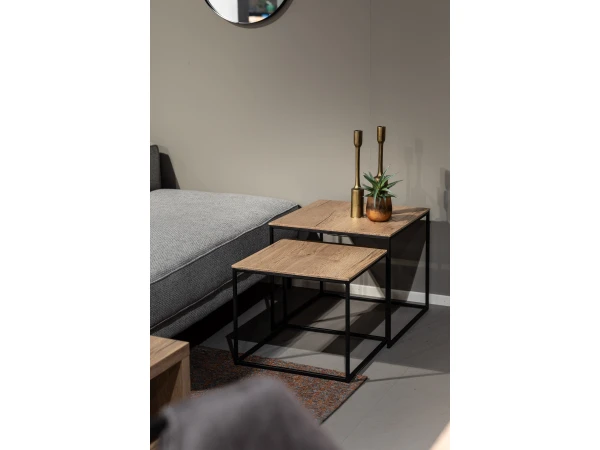 Deze set van 2 salontafeltjes Simon van Maxfurn beantwoorden aan de laatste interieurtrends, waar hoet en metaal een belangrijke rol spelen. Het tafelblad is uitgevoerd in Lamulux in de kleur natuur, dat de natuurlijke kenmerken van echt hout heeft, onderhoudsvriendelijk en krasbestendig is. Het onderstel in zwart metaal zorgt voor een elegante en eigentijdse uitstraling. Deze salontafels schuif je gemakkelijk in en uit elkaar, afhankelijk van hoeveel tafelruimte je nodig hebt. Trendy én praktisch!