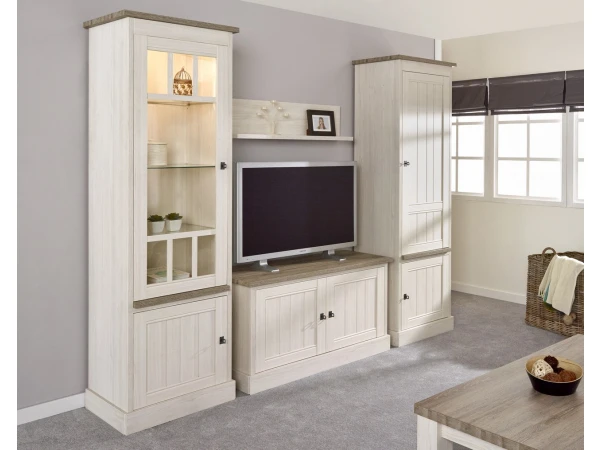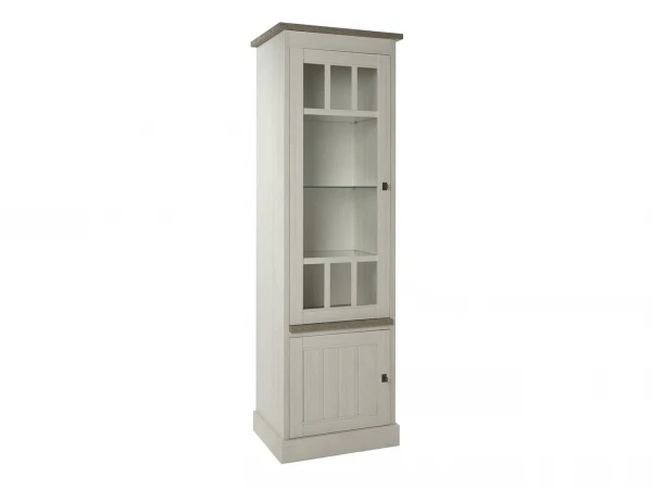 Deze smalle, landelijke vitrine heeft drie glazen schapjes waar je stofvrij je mooiste decoratie en fotokaders kunt uitstallen achter glas. Onderaan is er nog een gesloten houten deur voor extra opbergruimte. Gebruik deze smalle vitrine op zichzelf staand, of in combinatie met de andere meubelen uit de York collectie, bijvoorbeeld naast de tv-kast. Een landelijke vitrine, voor een prachtig landelijk interieur!