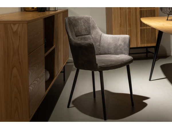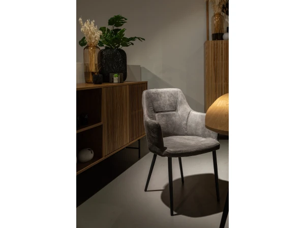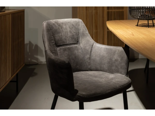 Deze stijlvolle moderne eetkamerstoel heeft een neutrale, tijdloze kleur en past daardoor in elk interieur! Zijn bekleding in lederlook is erg onderhoudsvriendelijk, en vormt een mooi geheel met de zwarte poten. De hoge rugleuning en armen zorgen voor extra comfort, om lekker lang te kunnen dineren.