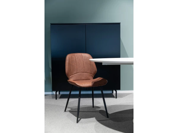 Deze stoere eetkamerstoel Billy heeft een bekleding in lederlook en zwarte metalen poten. Een stevige stoel met een robuust uiterlijk, geschikt voor een modern of industrieel interieur. Deze eetkamerstoel is beschikbaar in cognac, lichtgrijs en donkergrijs. Mix en match je favoriete kleuren, of ga voor je favoriete kleur voor een meer uniform geheel.