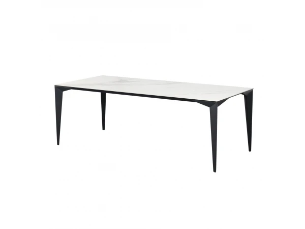 - Materiaal: keramisch bovenblad van 4 mm gelijmd op een getemperd glasblad van 8 mm en zwart metalen onderstel