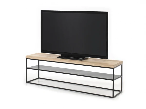 Deze tv console heeft een blad in massief eik en een zwart metalen onderstel met vak. De combinatie van hout met metaal geeft jouw interieur een moderne en gezellige uitstraling.