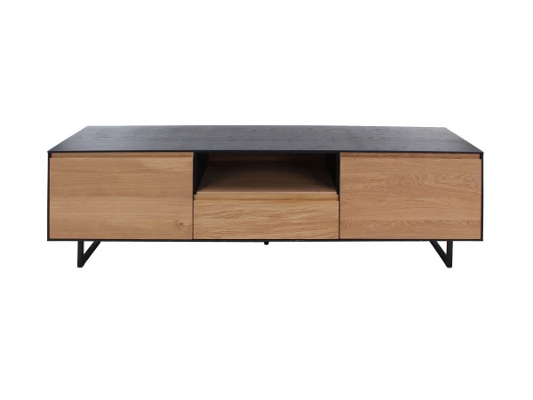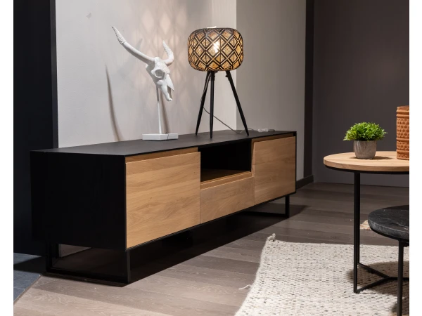 Dit tv-meubel heeft 2 deuren met in het midden een lade en open vak. De laden en deuren zijn voorzien van een uitsparing. Deze tv-kast is er ook nog in een kleinere uitvoering.
