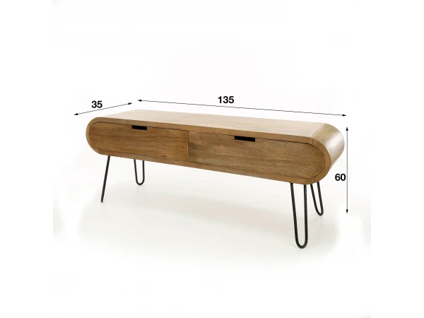 Tv-meubel ‘Barrel’ is uitgevoerd in mango hout met een zwart metalen frame. De ronde hoeken geven het tv-meubel een heel trendy uitstraling. Een echte musthave! Het mangohout zorgt ervoor dat dit tv-meubel terecht kan binnen een landelijk, modern interieur. Het naturel hout en zwarte metaal zijn gemakkelijk te combineren binnen elke woonstijl.