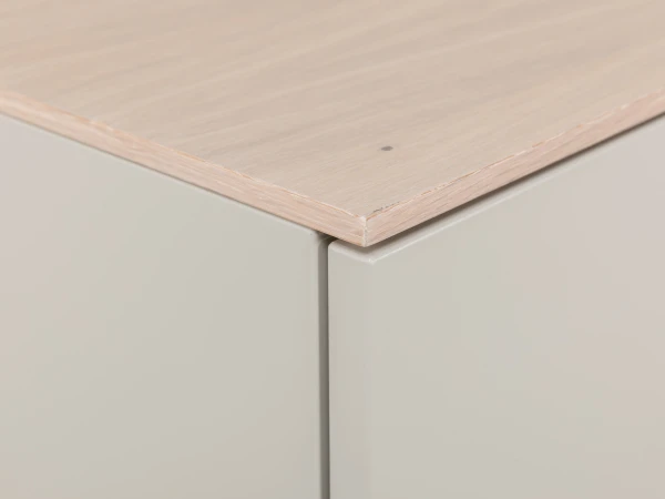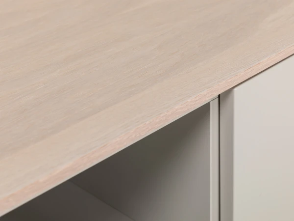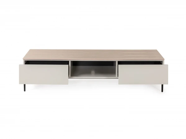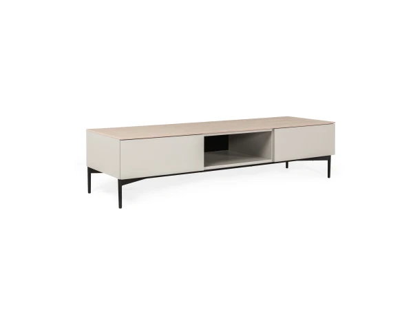 Dit moderne tv-meubel van Frans Bijnen beschikt over 2 laden en 1 open vak. De schuiven zijn voorzien van een push-systeem voor optimaal gebruiksgemak. Het stijlvol tv-meubel heeft grijze kanten en de toplaag is eiken hout. De zwarte metalen poten geven het geheel een luchtige look.