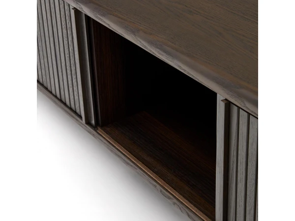 Laat je betoveren door het tv-meubel Mailen van Kave Home, een knipoog naar klassieke 18e-eeuwse meubels, gebracht met een hedendaagse twist. Vervaardigd uit hoogwaardig essenfineer met een donkere afwerking, straalt dit meubelstuk elegantie en ambachtelijk vakmanschap uit. De schuifdeurtjes met houten latjes vormen een speels contrast met het moderne design, waardoor Mailen de perfecte brug slaat tussen geschiedenis en hedendaagse stijl.