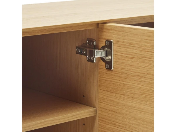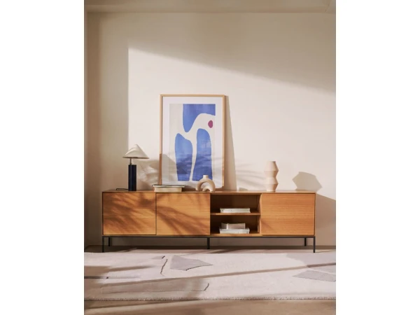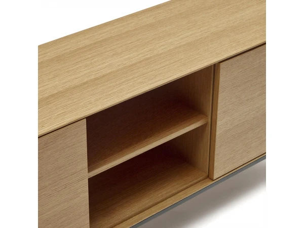 Met tv-meubel Vedrana heeft Kave Home weer een prachtig ontwerp gecreëerd, waarin functionaliteit en design samenkomen. Het meubel werd gemaakt van eikenfineer en heeft verstelbare stalen poten met een matte antraciet gelakte afwerking. Verder heeft Vedrana 3 push to open deuren en 1 open vak, waar je al je spulletjes in kan leggen. Het design past zich aan bij verschillende woonstijlen door zijn tijdloze en sfeervolle karakter. Laat dat gezellig tv-avondje maar al komen!