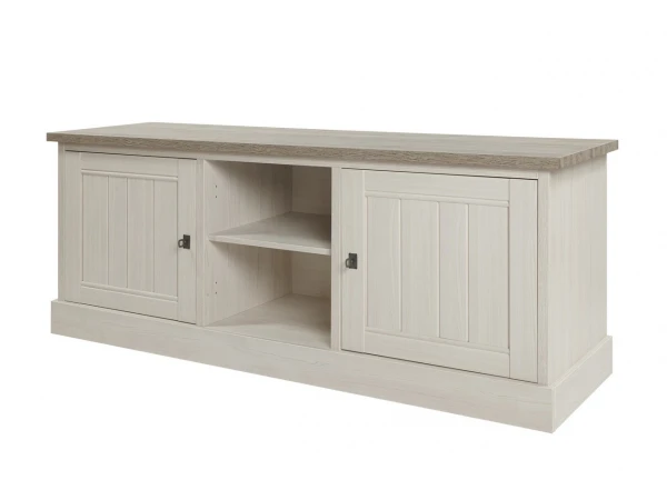 Tv-meubel York is afgewerkt in de landelijke stijl met metalen slotjes. Dit landelijke tv-meubel heeft 2 houten deuren, en in het midden een open vak met legplank, voor extra veel opbergruimte. Indien gewenst is er ook nog een kleinere versie beschikbaar.