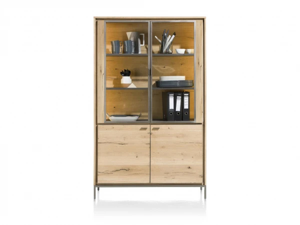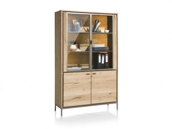Onze Xooon Faneur serie is een moderne, tijdloze serie. De collectie Faneur is voorzien van een lichte houtlook met mooie nerfstructuur. De details zijn strak en subtiel, met kleine handvaten en smalle poten. Deze prachtige vitrine Faneur zorgt ervoor dat je mooiste items goed tot zijn recht komen door de ingebouwde LED verlichting. De vitrinekast is voorzien van 2 glasdeuren en 2 houten deuren.