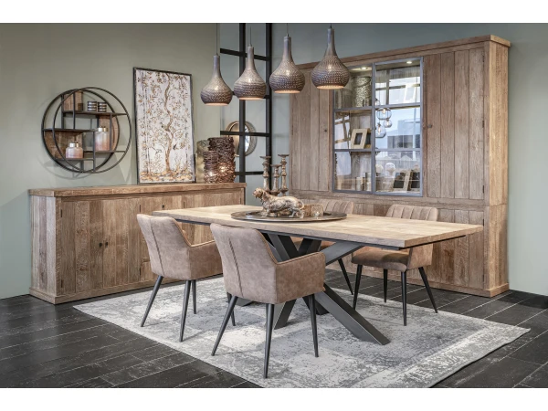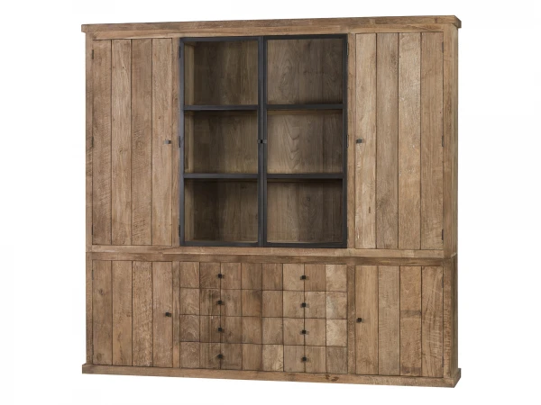 Deze landelijke vitrinekast in teak heeft een natuurlijke, warme uitstraling. De ledverlichting zorgt voor een gezellige sfeer in je woonkamer, en verlicht je fotokaders of decoratie, die je stofvrij achter het glas kunt bewaren. Deze vitrine heeft bovenaan 4 deuren, waarvan 2 glasdeuren, en onderaan 2 deuren en 8 laden. Genoeg opbergruimte dus! Deze landelijke vitrine past het best in een hedendaags landelijk interieur. De afwerking in metaal, waaronder de knopjes en omlijsting van de glasdeuren, zorgen voor een moderne toets.