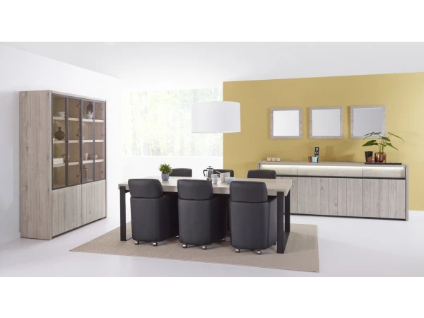 Eetkamer Lucca van Evan is een set hedendaags landelijke meubelen waarmee je een eigentijds en gezellig interieur creëert. De zwarte elementen geven de woonkamer meubelen een moderne feeling, terwijl de combinatie van hout en verlichting een gezellige sfeer uitstraalt.
