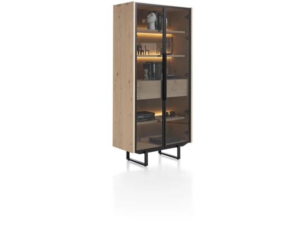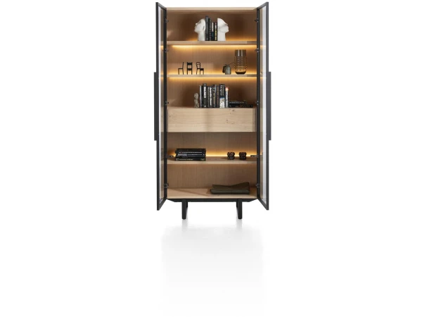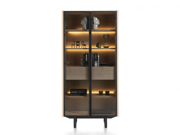 De vitrine uit de Modali collectie heeft 2 deuren en 1 lade met soft-closingsysteem. Je hebt dus genoeg plek om jouw spullen in kwijt te kunnen. De stijlvolle vitrine staat op stevige zwart metalen poten, wat het houten geheel een luchtig gevoel geeft.