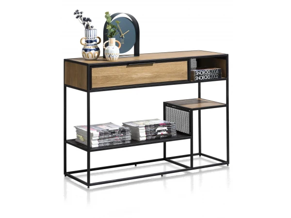 De City collectie van Henders and Hazel bestaat uit een selectie meubels met een industrieel en strak design. Deze wandtafel uit de City collectie bestaat uit een metalen profiel en houten planken. De metalen accenten geven een stoere en industrieel karakter aan deze wandtafel. Het past perfect op veel plekken in jouw interieur. Denk maar aan plaatsen zoals de hal, achter de zetel, tegen een lege muur en zelfs in de keuken.