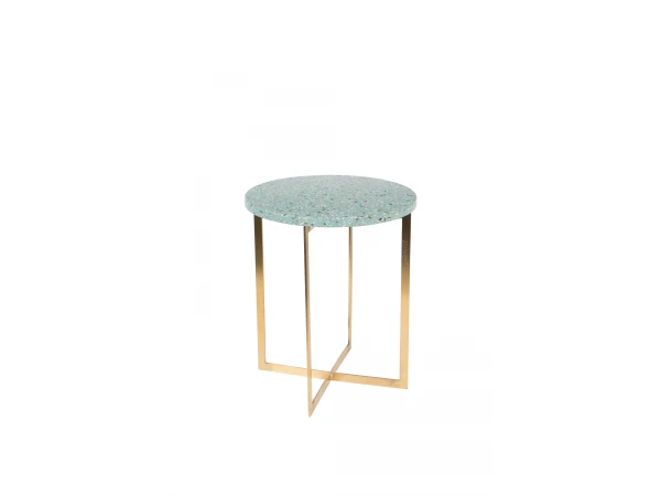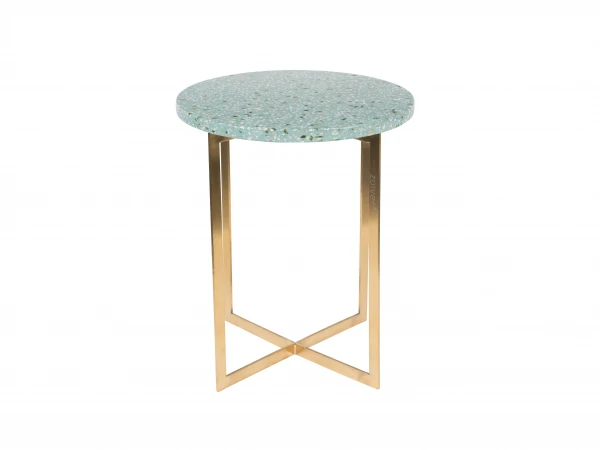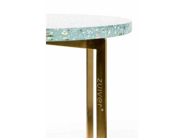 Terrazzo is een interieurtrend overgewaaid uit Italië waarbij stukjes marmer in een stenen blad worden gegoten, en zo een speels mozaïek effect tot stand komt. In dit bijzettafeltje wordt de terrazzo techniek in prachtige kleuren gegoten en gecombineerd met een uniek gouden onderstel. Kies uit 4 zachte kleuren met een rond of vierkant tafelblad, of ga voor een mooie mix.